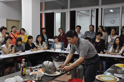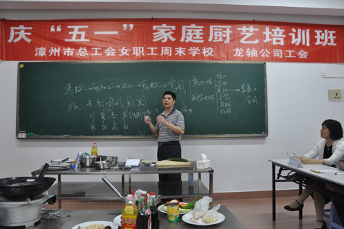 從2014年4月21日起,每逢周一晚上,公司幾十名廚藝愛好者都會興致勃勃地聚集在漳州市總工會職工業余學校,一起認認真真地學習廚藝,捧著筆記本仔細記下授課老師講解的做菜要點,睜大眼睛盯著授課老師的現場操作,從烹飪的基礎知識、刀功的基本要領、配菜的基本方法到一道道葷素搭配、家??梢姷拿牢都央热缰ヂ殡u、排糖醋肉、紅燒魚塊、椒鹽海蠣、松仁玉米、沙司茄子等,都生怕落下一個小小的細節……
