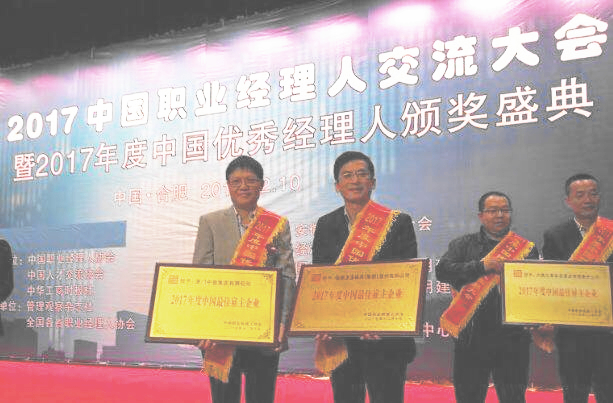 ????2017年12月10-11日, 由中國職業(yè)經(jīng)理人協(xié)會、中國人才交流協(xié)會、中國工商時報社共同主辦,由管理觀察雜志社、各省職業(yè)經(jīng)理人協(xié)會共同承辦的2017中國職業(yè)經(jīng)理人大會在安微合肥隆重召開。會上,公司被授予“2017年度中國最佳雇主企業(yè)”稱號。公司副總經(jīng)理鄭長虹受邀參加此次盛會,并領取了獎牌。