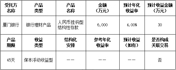 本次委托理財金額:委托廈門銀行理財6,000萬元。