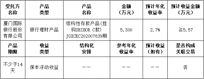 本次委托理財(cái)金額:委托廈門(mén)國(guó)際銀行理財(cái)5,300萬(wàn)元。