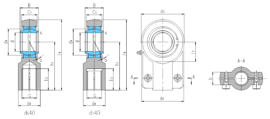 產品特點:帶鎖口桿端關節軸承由桿端體和向心關節軸承GEEW…ES組裝而成,用擋圈固定,d<63,桿端體材料是碳鋼,63≤d≤80,桿端體材料是碳鋼或球墨鑄鐵,d>80,桿端體材料是球墨鑄鐵,桿端體的內螺紋帶有鎖口,配有螺釘緊固;可通過油杯潤滑。