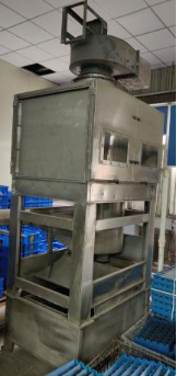 5)設備的水除塵采用專用水噴淋除塵設備。整體應采用不銹鋼制造,含支架、外殼及內部過濾網。空氣由下部通入,上部出氣(下行的水管應深入水箱底部,再讓水流溢流至過濾網,必要時增加引風機,確保含塵氣體上逸。);底部設有水池,配有浮標,池中的水可自動補充,水池底部配有排污裝置,可將粉塵等沉淀物排出;系統配有獨立開關,可控制除塵的啟停;箱內過濾的濾網采用不銹鋼濾網并在隔層內加裝吸塵小球,噴水閥采用消防噴水頭。具體樣式參照我司現有水除塵設備樣式,如下圖: