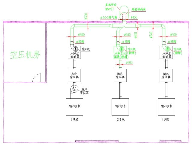 1)我司現有三條噴砂線,其中有兩臺為含水除塵設備,另一臺不含水除塵設備。本次噴砂粉塵處理系統需配備一臺水除塵設備,并將三條噴砂線的尾氣引外排放,且滿足三條噴砂線同時運行排氣的需求。