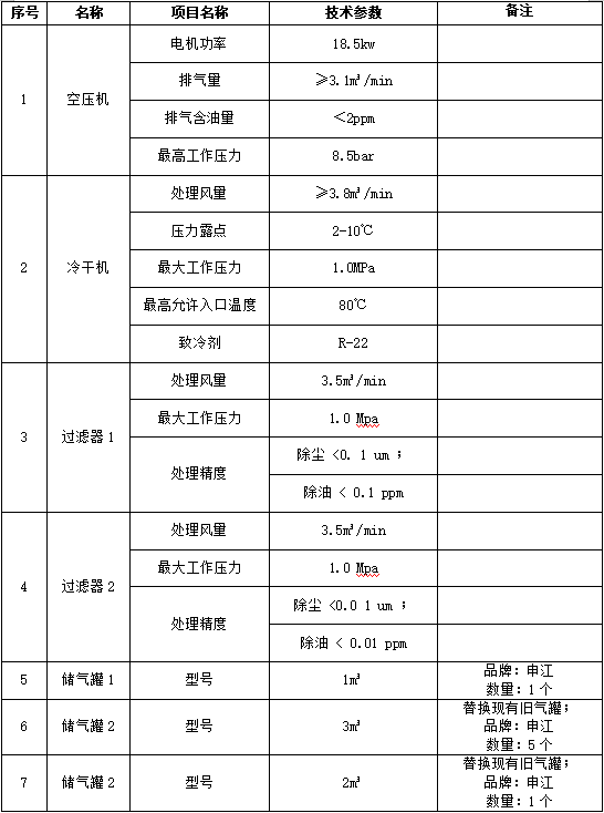 項(xiàng)目名稱:購(gòu)置1套空壓機(jī)系統(tǒng)(約18.5kw,含配套冷干機(jī)、1m³氣罐、過濾器)