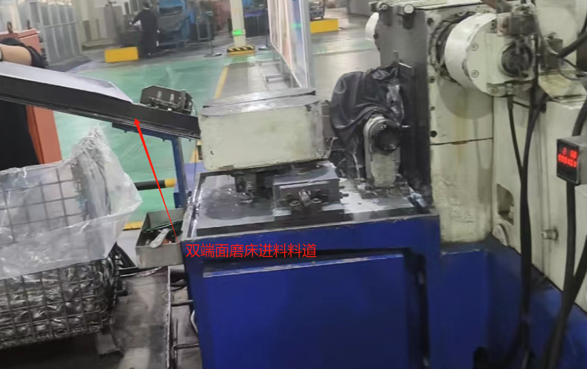 (來料)料籃整框上料→雙端面磨床進料槽→磨削→雙端面磨床出料槽→計數→分料 →進出料箱