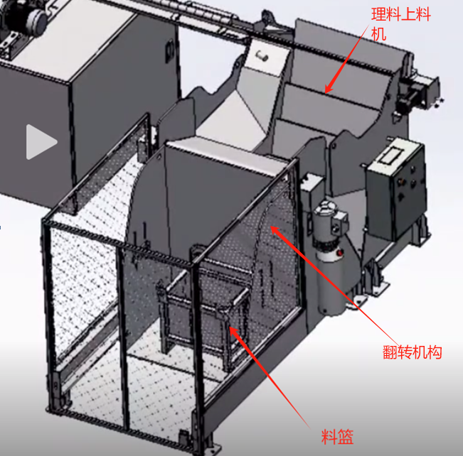 1.1上料:實現整籃上料,翻轉機構將料籃翻轉,物料間歇式倒入理料機(料籃翻轉角度可控),理料機自動理料,有序送料至雙端面磨床進料料道。