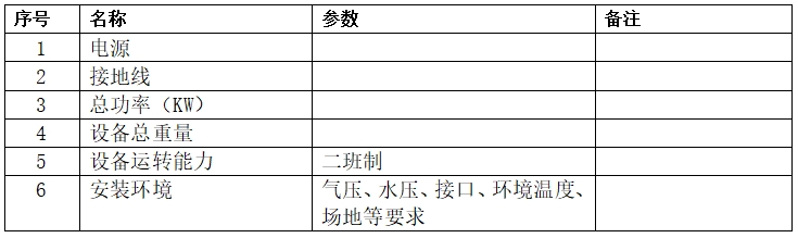 3.設備其他技術指標:(需含設備總功率、電壓、電流、氣壓、水壓、接口、環境溫度、場地等安裝環境有關要求)