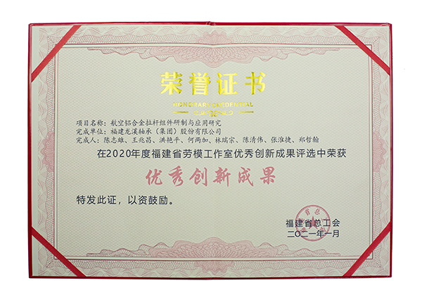 2021年1月11日,福建省總工會發布了《關于命名“福建省(示范性)勞模工作室”和發布福建省勞模工作室優秀創新成果的通知》,公司陳志雄勞模工作室被命名為“福建省示范性勞模工作室”,由陳志雄帶領團隊完成的“航空鋁合金拉桿組件研制與應用研究”項目被授予“福建省勞模工作室優秀創新成果”榮譽稱號。
