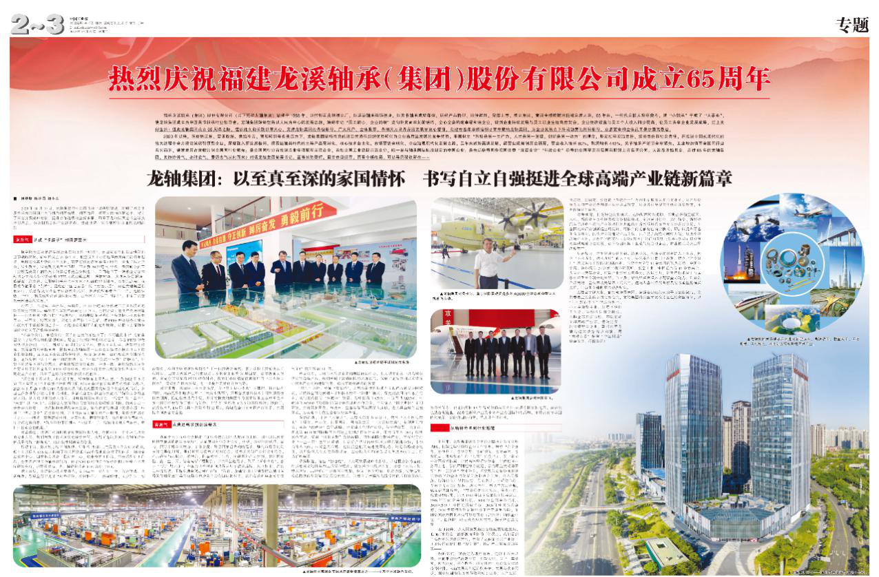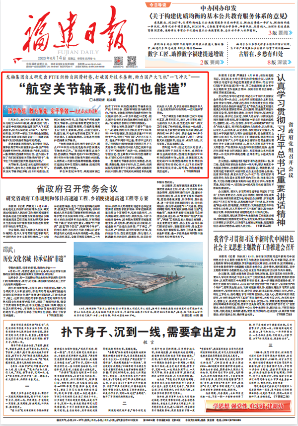 6月14日,《龍軸集團自主研發出PTFE織物自潤滑襯墊,打破國外技術壟斷,助力國產大飛機“一飛沖天”——“航空關節軸承,我們也能造”》榮登《福建日報》頭版頭條。