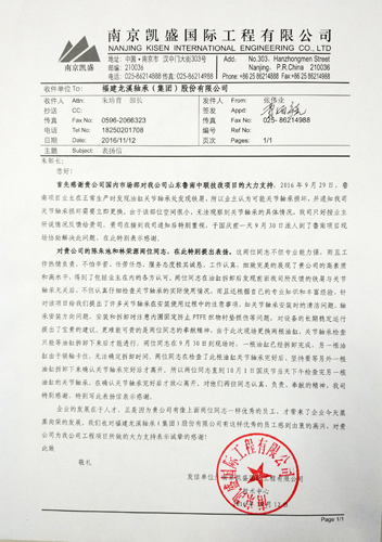 近日,一封表揚信寄到了公司國內市場部。原來,為感謝公司技術員陳朱池、林榮源提供的細致貼心的技術服務,南京凱盛國際工程有限公司(下稱南京凱盛)特意寄來了這封表揚信。