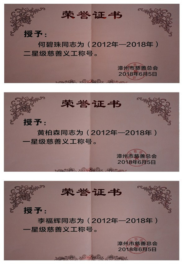 2018年6月5日,首屆漳州市星級(jí)慈善義工分隊(duì)、星級(jí)慈善義工授星儀式在漳州市慈善總會(huì)舉行,公司何碧珠同志榮獲二星級(jí)慈善義工稱號(hào),黃柏森同志和李福輝同志榮獲一星級(jí)慈善義工稱號(hào)。公司義工分隊(duì)自2012年成立以來,圍繞“志愿、無償、友愛、互助”的服務(wù)精神,在扶貧濟(jì)困、安老扶幼、助學(xué)助醫(yī)、社區(qū)服務(wù)、慈善宣傳等方面積極開展志愿服務(wù)活動(dòng),為建設(shè)美麗、富裕、幸福漳州做出了龍軸貢獻(xiàn),充分體現(xiàn)了公司做為全國文明單位在履行社會(huì)責(zé)任、推進(jìn)幫扶工作的示范帶頭作用。