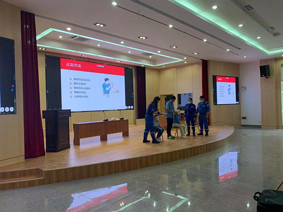 在急救技能實操部分,教官重點演示了心肺復(fù)蘇技術(shù)、海姆立克急救法、外傷包扎技術(shù)等日常實用的急救技術(shù),并現(xiàn)場邀請參與培訓(xùn)的員工上臺參與實操。公司員工踴躍參與,教官細心指導(dǎo),及時糾正員工的錯誤動作,現(xiàn)場氣氛活躍。