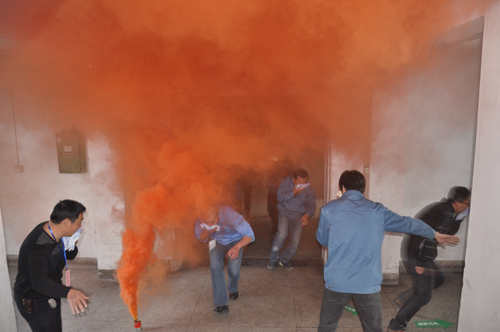 演練開始,信號組在得到演練命令后,立即發(fā)出火警訊號。同時在各個指定點放啟煙霧彈,樓梯道和走廊瞬間濃煙滾滾,各演練組在聽到逃生訊號后,在逃生組長的的組織下,迅速有序地從車間里往車間外疏散,每人用濕毛巾捂住嘴巴,彎腰匍匐前進(jìn),按規(guī)定的順序出了車間后分別從中線(沿樓梯道)和南線(沿走廊)繼續(xù)疏散,最后沖出煙區(qū)。救援組的人員跟隨疏散途中搶救了一名受傷人員(專人份演),在煙霧中,他們抬著擔(dān)架將傷員救出,到達(dá)指定地點集中,最后一名員工到達(dá)指定集合地點的時間是1分17秒。